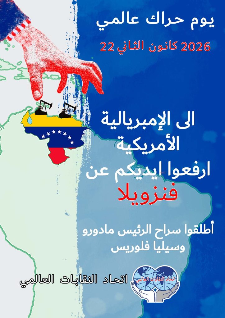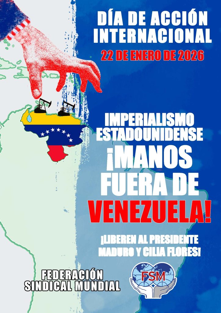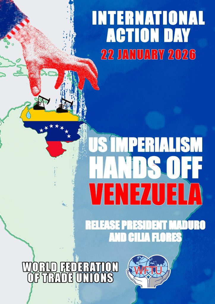 The WFTU secretariat, following solidarity initiatives of the class-oriented trade union movement that have been developed from the very first moment, decided to initiate an International Action Day in Solidarity with the people of Venezuela on January 22nd, 2026. The WFTU calls upon its members to actively participate in the International Action Day, organizing militant initiatives before the US embassies under the slogans “US Imperialism Hands off Venezuela” “Release President Maduro and Cilia Flores.”