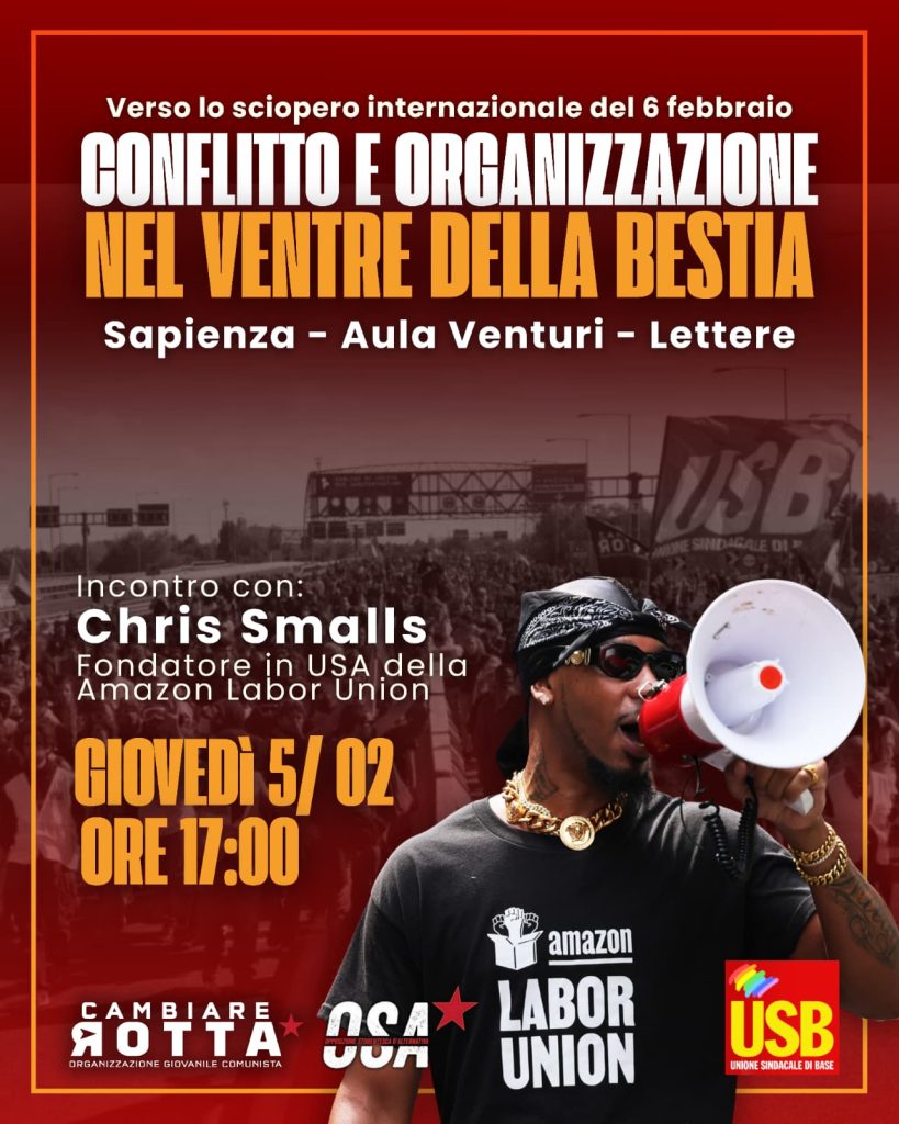 - il 5 febbraio incontro con il sindacalista Amazon Chris Small alle ore 17.00 presso l’aula Venturi della facoltà di Lettere dell’Università della Sapienza a Roma;
