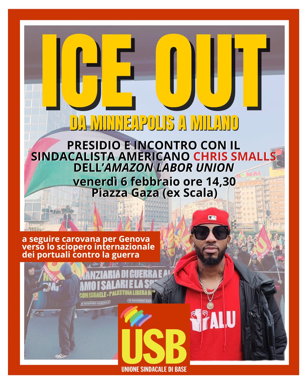 - il 6 febbraio a Milano alle 14.30 in Piazza Gaza (ex Scala) con lo slogan “ICE OUT!” dopo la quale l’iniziativa poi si sposterà in carovana a Genova in occasione dello sciopero internazionale dei porti
