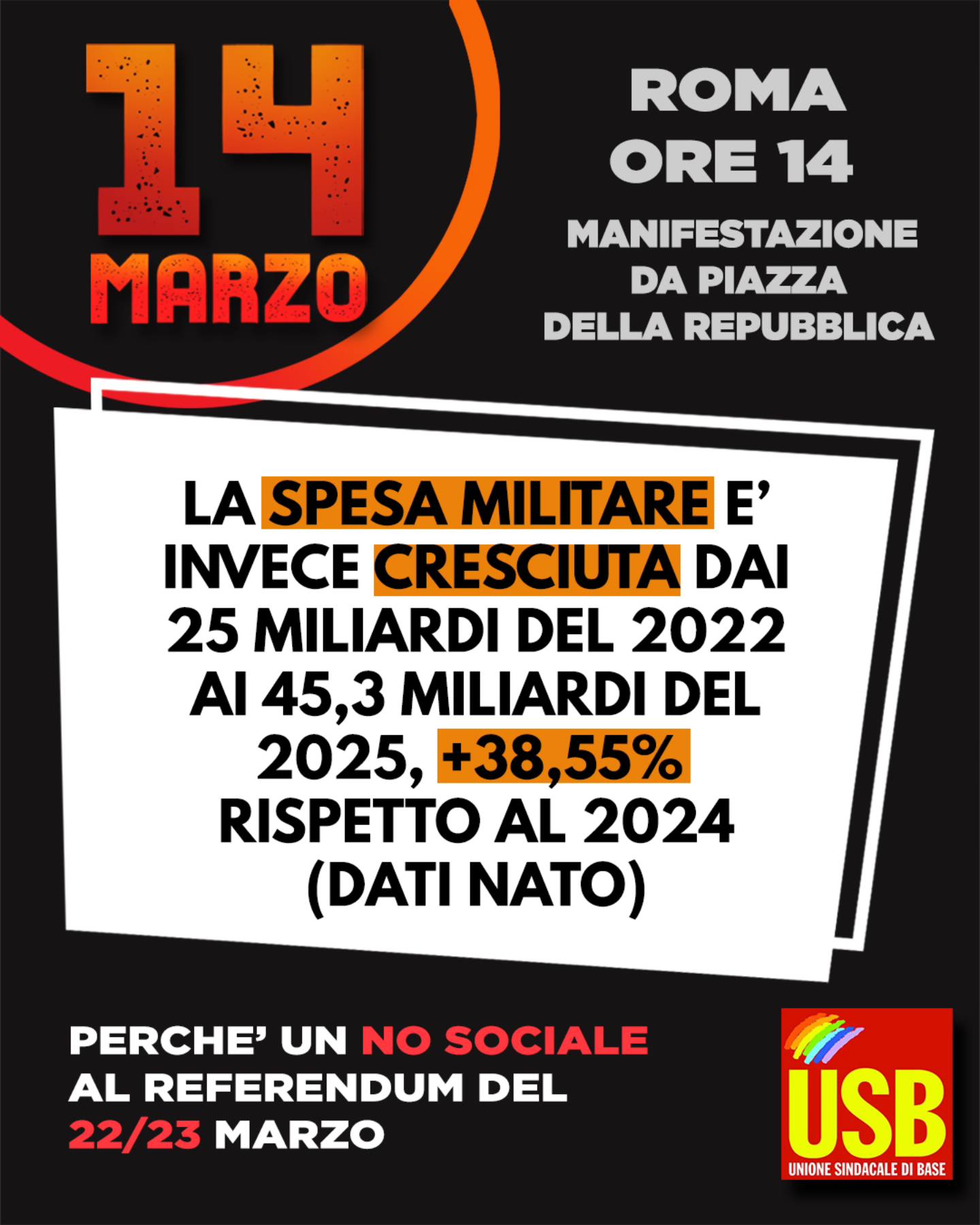 Unione Sindacale di Base is organizing a national demostration on the day 14th March 2026 in Rome against war economy and exploitment of workers and decreasing wages. Here the original communication of USB in italian: