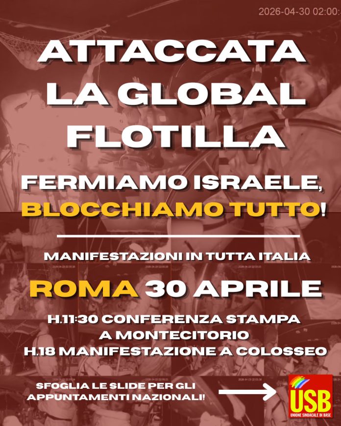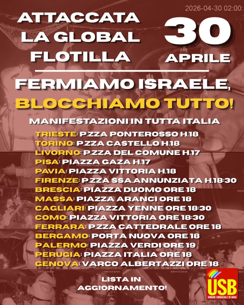 Unione Sindacale di Base (USB) will be present in the manifestations in many cities and towns in Italy today, in support and solidarity with the Global Flotilla attacked tonight by Israeli forces, the activists and the Palestinian people. USB has been the front-line of the solidarity and support for Palestine and the Flotilla both in Italy than in the world, specially in the large and powerful manifestations held in autumn 2022 in Italy (like the 22th September in Rome, were millions of people blocked the italian capital in support of the Palestinian people and against the war).